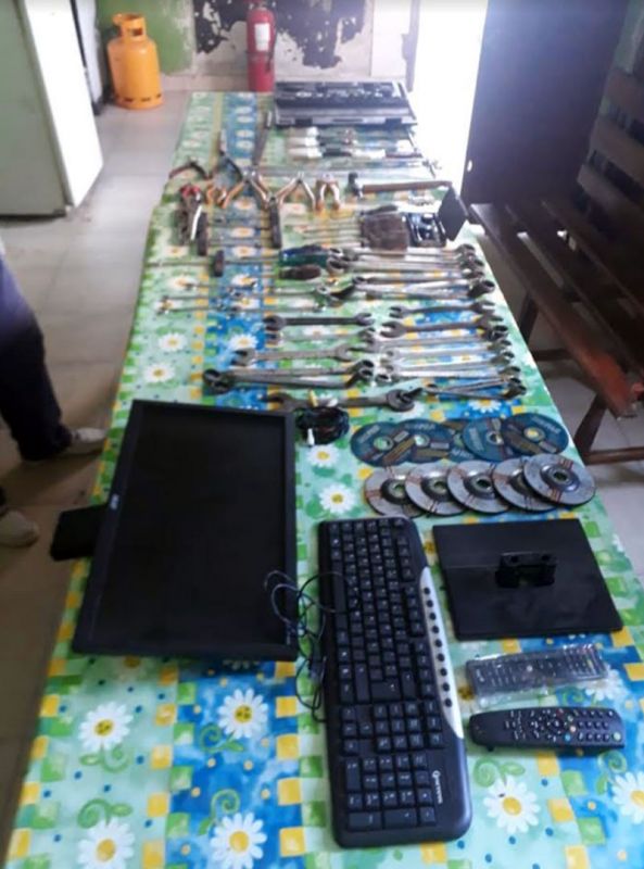 Efectivamente, se trataba de una parte del botín que se hallaba oculto, y en un primer momento, encontraron 1 monitor Acer y 2 teclados Netsys, negros, y algunas herramientas, 2 calibres; 5 cuchillos; 1 lima; 2 reglas de metal y 2 controles.