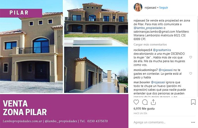 "Se vende esta propiedad en zona de Pilar. Para más info comunicate a @lambo_propiedades o sabrinarojas.lambo@gmail.com. Martillero Mariana Lamborizio matrícula 6021 CSI 6999 CPI", escribió, junto a una serie de imágenes en donde muestra una impactante casa con amplio jardín y piscina en zona norte, más precisamente en Pilar.