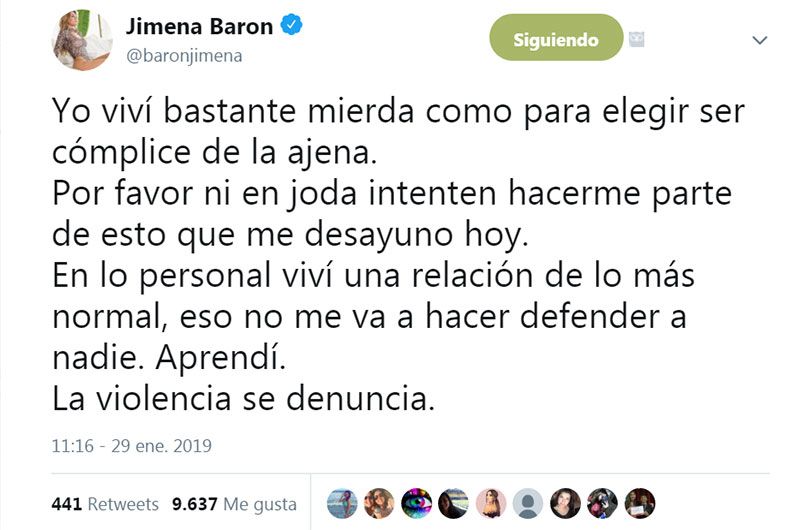 Al finalizar la entrevista con Vega, la exparticipante del Bailando 2018 escribió en su cuenta de Twitter: "Yo viví bastante mier... como para elegir ser cómplice de la ajena. Por favor ni en joda intenten hacerme parte de esto que me desayuno hoy. En lo personal viví una relación de lo más normal, eso no me va a hacer defender a nadie. Aprendí. La violencia se denuncia".