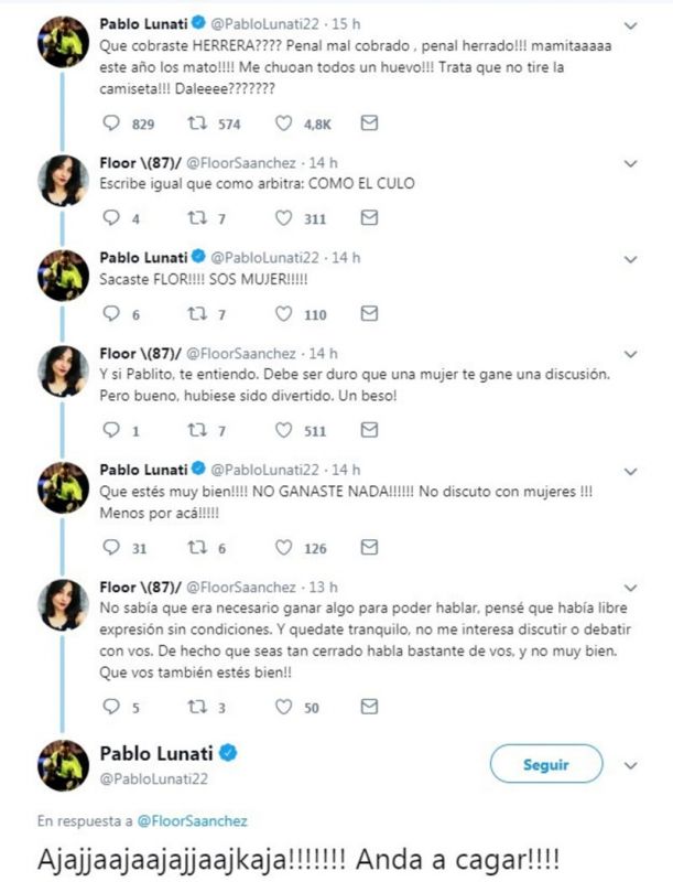 Luego de ese tuit, fueron varios los que salieron al cruce del nuevo "mediático" y ahí mostró su lado más sexista y ninguneó a una dama. "Sos mujer. No discuto con mujeres", respondió ante una crítica.