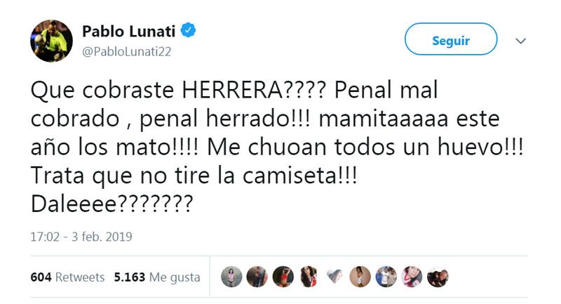 "Qué cobraste HERRERA???? Penal mal cobrado , penal errado!!! Mamitaaaaa este año los mato!!!! Me chupan todos un huevo!!! Trata que no tire la camiseta!!! Daleeee???????", puso Lunati en su Twitter.