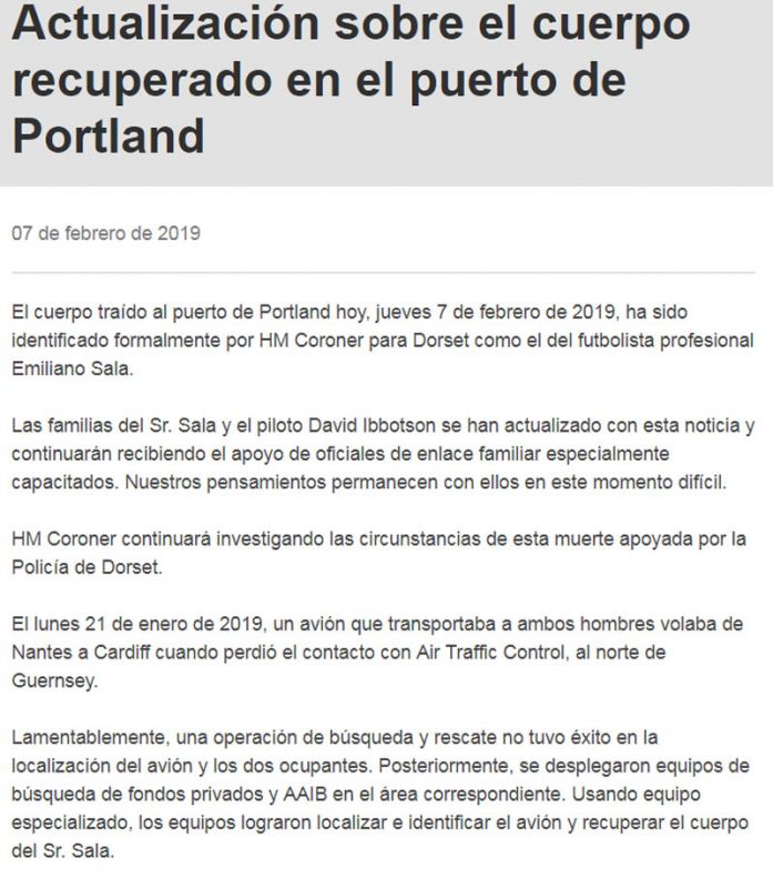 La policía de Dorset, Inglaterra, comunicó oficialmente en su cuenta de Twitter que el cuerpo rescatado de la aeronave hundida en el Canal de la Mancha fue identificado como el de Sala. Además, indicó que tanto la familia del argentino como la del piloto David Ibbotson, que permanece desparecido, fueron notificadas al respecto.