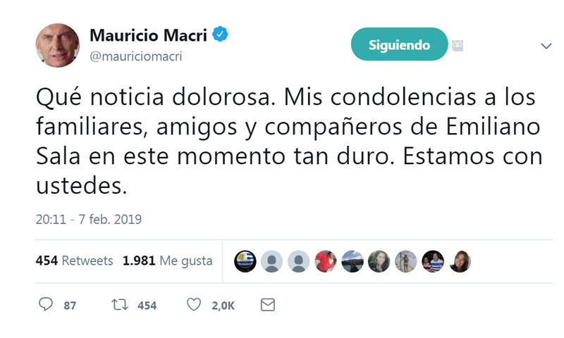 "Qué noticia dolorosa. Mis condolencias a los familiares, amigos y compañeros de Emiliano Sala en este momento tan duro", expresó el mandatario, y cerró: "Estamos con ustedes".