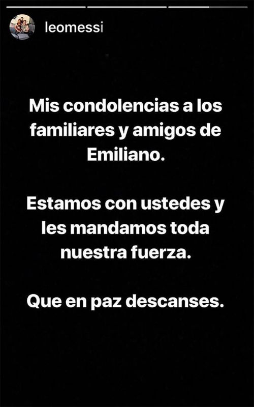 "Mis condolencias a los familiares y amigos de Emiliano. Estamos con ustedes y les mandamos toda nuestra fuerza. Que en paz descanses", fue el recado de luto que compartió Messi en una historia de Instagram.