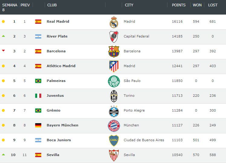 Esta nómina elaborada por World Club Rankings tiene en cuenta la performance de los equipos durante las últimas 52 semanas (1 año) y en ese período River cosechó una gran cantidad de victorias importantes como el título de la Copa Libertadores. La fórmula que calcula los puntajes pondera de gran manera las competencias internacionales aunque ganarle a rivales fuertes también ayuda a acumular más puntos.