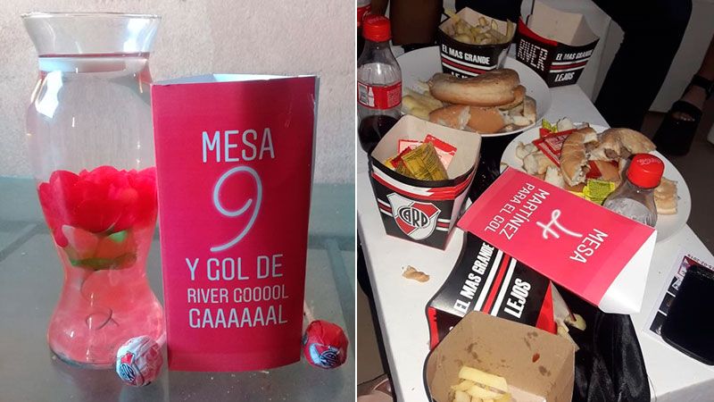 Su vestido fue del mismo flamante rojo de la banda que atraviesa el pecho de la camiseta de “Los Millonarios”, toda la ornamentación fue de blanco, rojo y negro, los invitados se pudieron caretas con las caras del “Pity” Martínez. Los centros de mesas tenían, no sólo los colores de River, si no que los nomencladores tenían el número y fragmentos del relato del gol que coronó el histórico 3 a 1 en la final de la Copa Libertadores a su clásico rival, Boca Juniors.