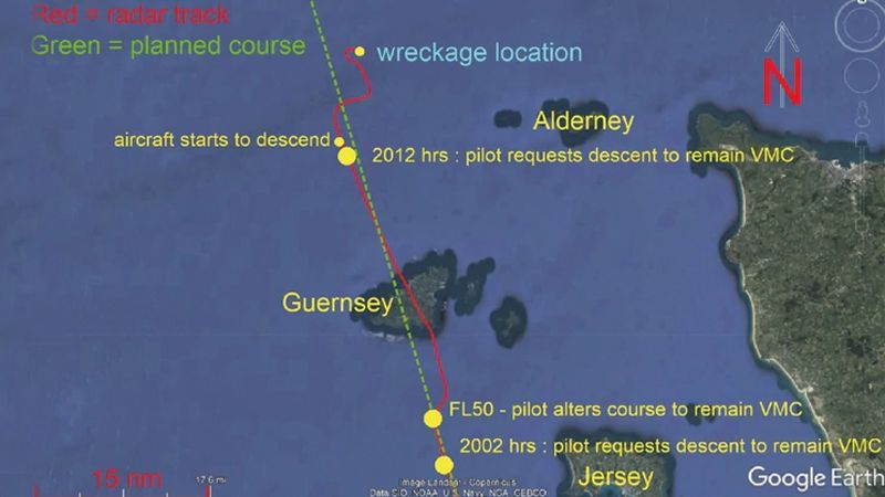 La publicación de la AAIB, que fue compartida en español por la Junta de Investigación de Accidentes de Aviación Civil de Argentina (JIAAC), indica que a las 20:02:10 el piloto solicito autorización para descender para "mantener VMC". Se encontraba 20 kilómetros al sur de la Isla de Geuernsey y 17 kilómetros al oeste de Jersey.