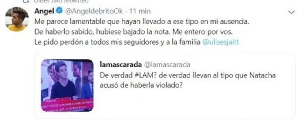 Luego, arrobó a la cuenta por la que recibió la noticia de lo que estaba pasando en "LAM" y se disculpó con sus seguidores y con la familia de Natacha. Lo expresó así: "Me entero por vos (@lamascarada). Le pido perdón a todos mis seguidores y a la familia de @ulisesjaitt".