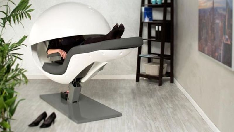 La compañía MetroNaps de Christopher Lindholst vende el EnergyPod, una especie de cama reclinable de la era espacial para los empleados para que duerman una siesta rápida en el trabajo.