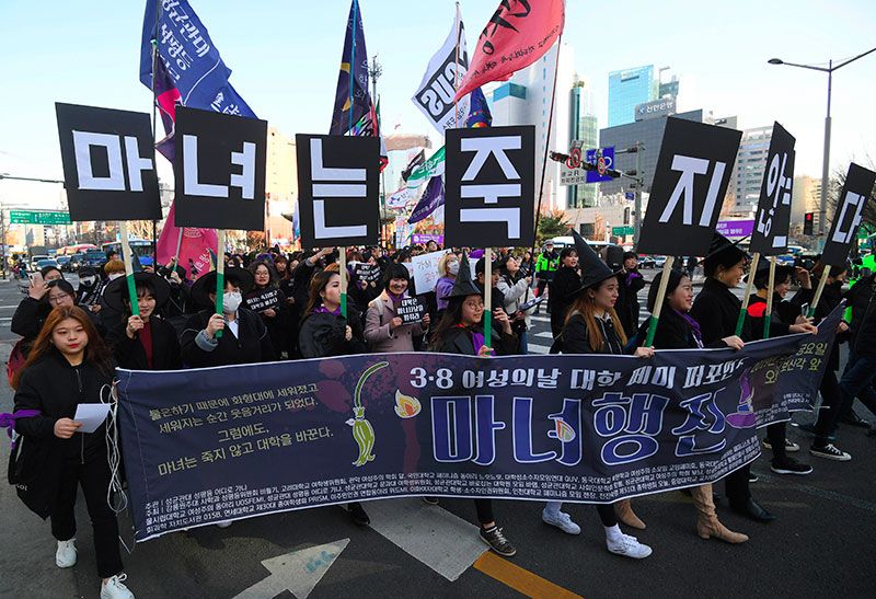 Corea del Sur: Mujeres surcoreanas vestidas como brujas participan en una marcha de apoyo al feminismo durante una protesta para conmemorar el Día Internacional de la Mujer en Seúl.