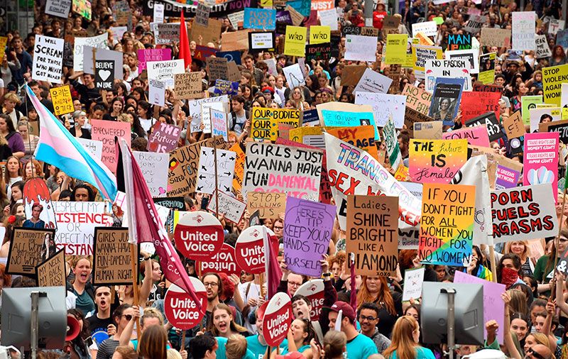 Australia: La gente sostiene pancartas mientras miles de personas marchan para conmemorar el Día Internacional de la Mujer en Melbourne .