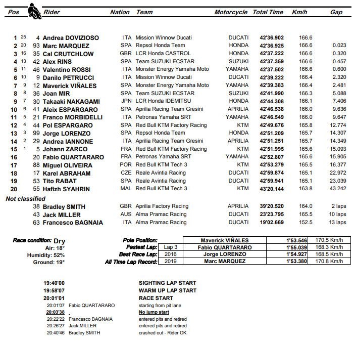 El top 10 de la carrera los completaron Danilo Petrucci (Ducati), Maverick Viñales (Yamaha), Joan Mir (Suzuki), Takaaki Nakagami (Honda) y Aleix Espargaro (Apirilia).