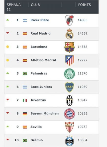 River apareció este lunes en lo más alto del ranking mundial de clubes, aún por encima de Real Madrid, Barcelona, Atlético de Madrid y Palmeiras.
