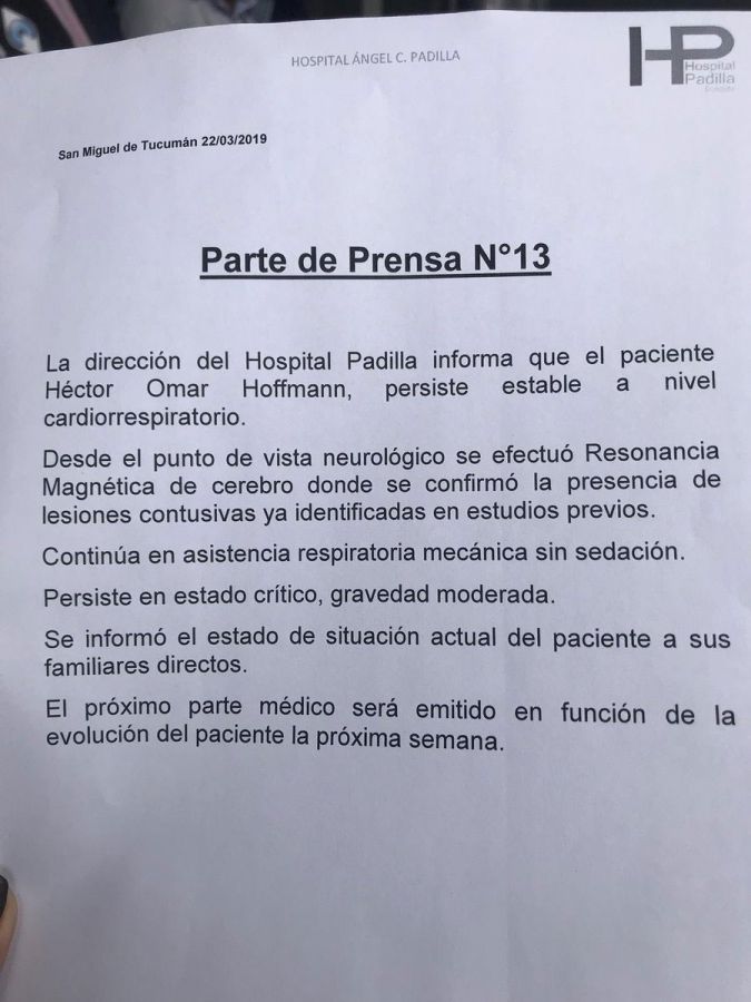 Según indica el nuevo parte médico, el cantante de 70 años "persiste estable a nivel cardiorrespiratorio". "Desde el punto de vista neurológico se efectuó Resonancia Magnética de cerebro donde se confirmó la presencia de lesiones contusivas ya identificadas en estudios previos. Continúa en asistencia respiratoria mecánica sin sedación. Persiste en estado crítico, gravedad moderada", detalla el informe que difundió el hospital este viernes y aclararon que la próxima semana habrá uno nuevo.