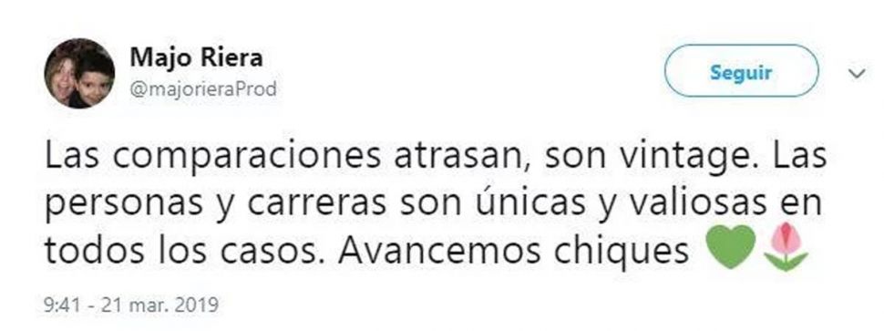 La productora tildó el asunto de "vintage" y disparó: "Las comparaciones atrasan. Las personas y las carreras son únicas y valiosas en todos los casos. Avancemos chiques”. Ambas actrices y cantantes, talentosas y muy populares desde chicas, jamás pudieron ponerle un freno a los dos bandos que cobraron más fuerza cuando la actriz de Violetta comenzó a salir con Peter Lanzani, ex de la chica Teen Angels.