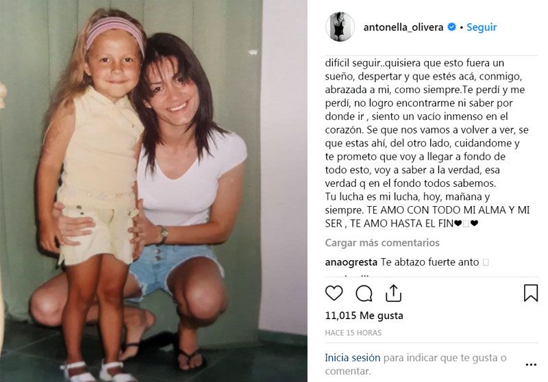 "Hoy se cumple un mes desde que te fuiste, no sabés lo que estoy sufriendo, cada día se me hace bastante difícil seguir… Quisiera que esto fuera un sueño, despertar y que estés acá, conmigo, abrazada a mí, como siempre. Te perdí, no logro encontrarme ni saber por dónde ir, siento un vacío inmenso en el corazón", escribió Antonella en la publicación.
