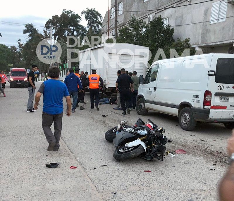 Una cámara de seguridad ubicada sobre Avenida hipólito Irigoyen captó el momento del accidente: cómo el conductor sale despedido e impacta contra la caja de un camión estacionado.