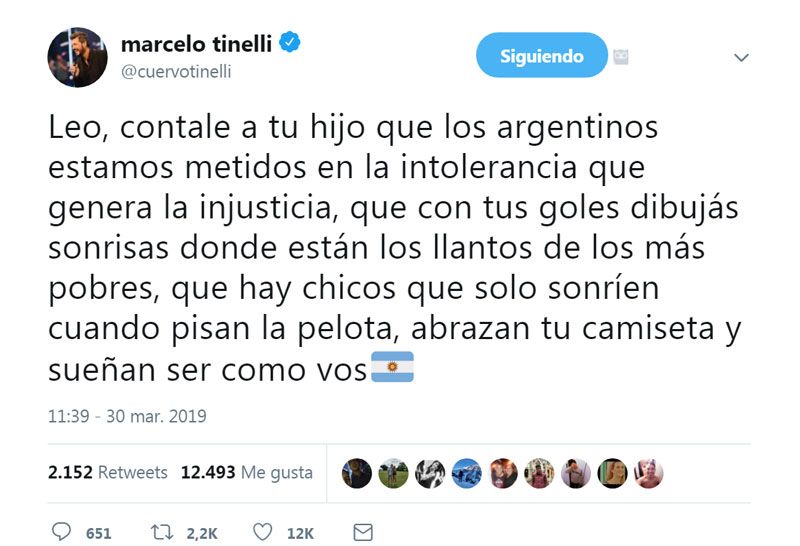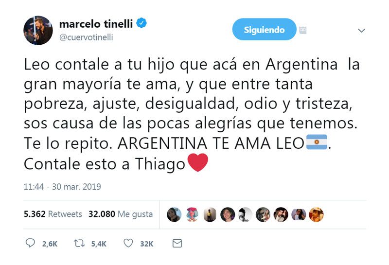 “Leo, Argentina te ama. Contale a tu hijo Thiago que acá en Argentina la gran mayoría te ama y que entre tanta pobreza, ajuste, desigualdad, odio y tristeza, sos causa de las pocas alegrías que tenemos”, escribió Tinelli.