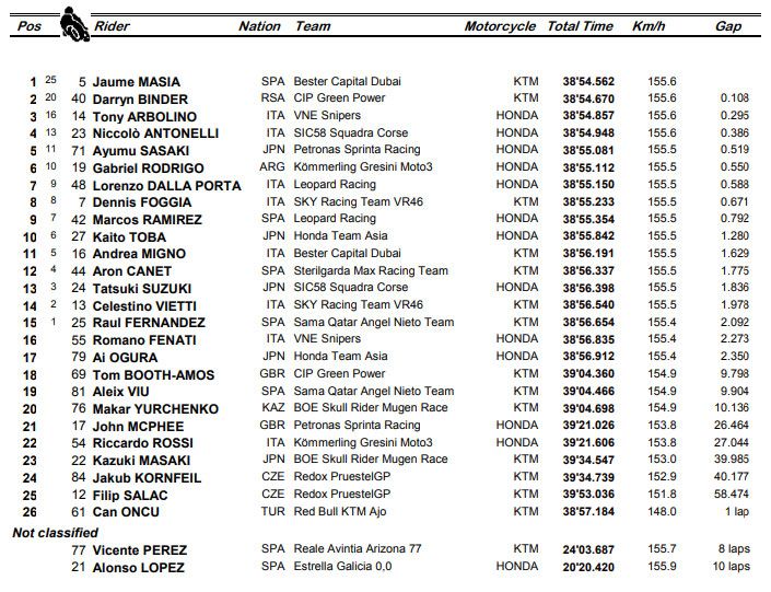 Por su parte, Darryn Binder se acomodó en el segundo lugar del podio a 108 milésimas del líder, y Tony Arbolino completó el podio a 295 milésimas del ganador. En tanto, Niccolò Antonelli y Ayumu Sasaki completaron el top 5 de la carrera.