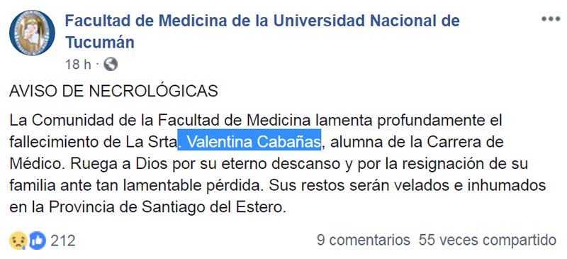 Valentina Cabañas era santiagueña, tenía 31 años y estudiaba Medicina en la Universidad Nacional de Tucumán.
