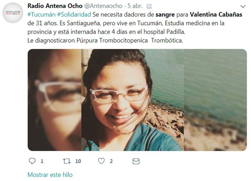 Valentina Cabañas tenía 31 años; le habían diagnosticado Púrpura trombocitopénica trombótica y estaba internada en esa provincia.