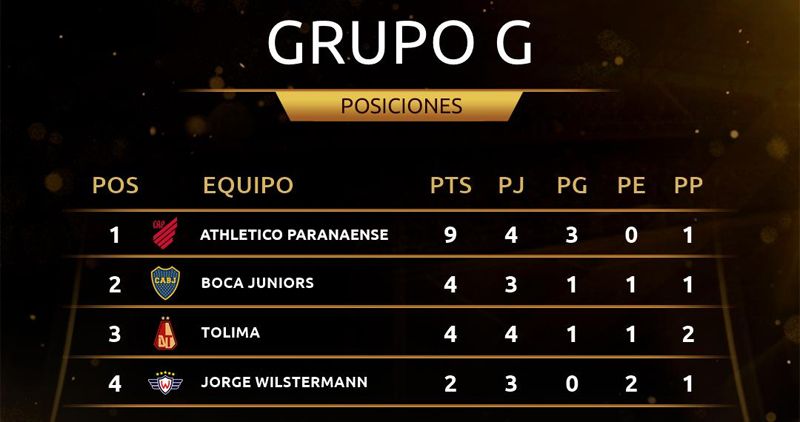 Paranaense, campeón de la Copa Sudamericana de 2018, se mantiene en la primera posición del grupo con nueve puntos, cinco más que el Tolima, mientras que Boca también acumula cuatro unidades, mientras que Wilstermann suma dos