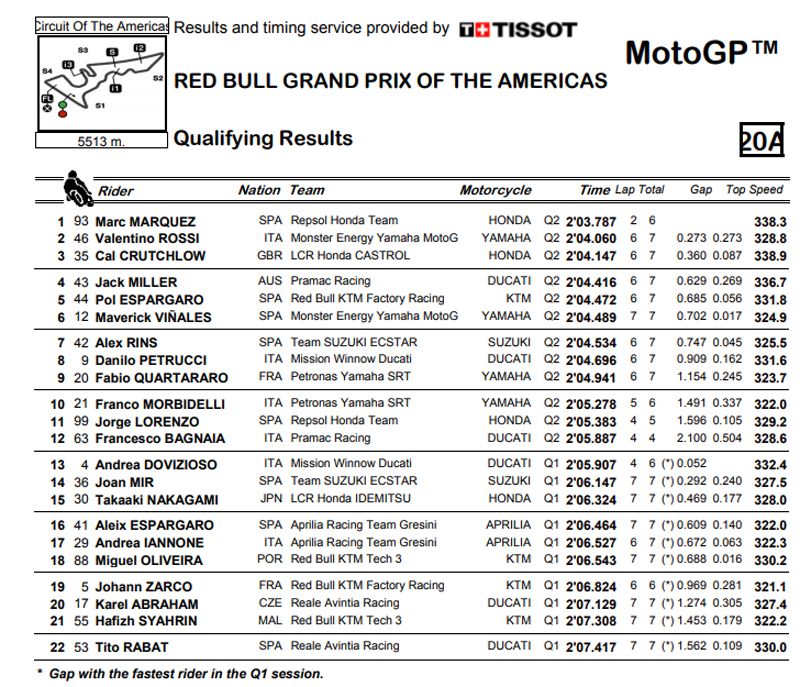 La carrera del Moto GP se iniciará mañana a las 16.00 hora argentina (14.00 de Estados Unidos), a 20 giros, al circuito de 5.500 metros de extensión.