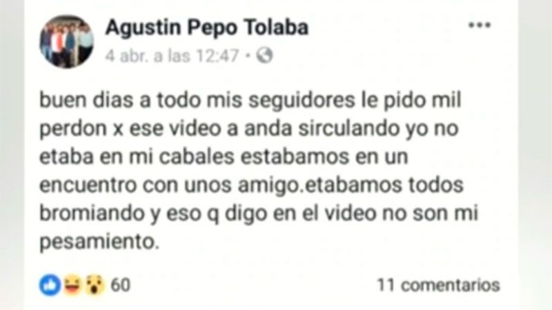 A través de sus redes sociales, Tolaba se retractó de las palabras que dijo en el video. Al menos así lo sostuvo en una publicación que realizó en su cuenta de Facebook: "Buenos días a todo mis seguidores. Le pido mil perdones por ese video que anda sirculando (sic). Yo no etaba en mi cabales, estábamos en un encuentro con unos amigos".