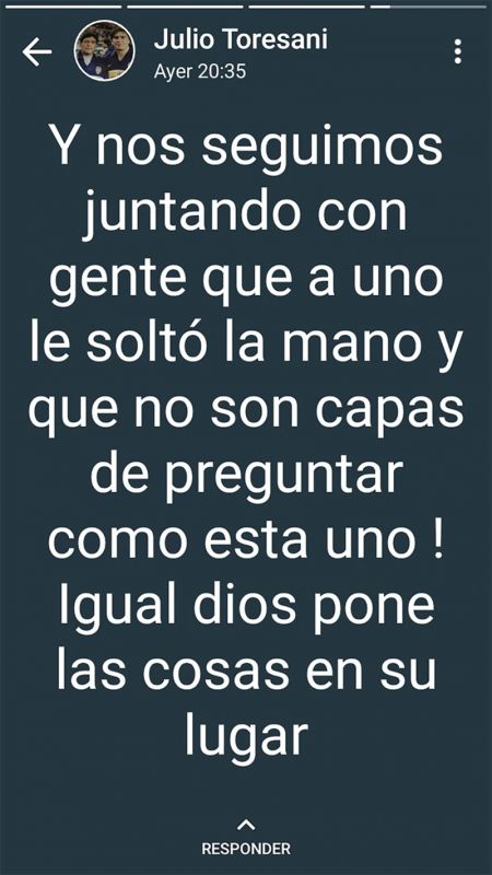 "Llegó el momento, demasiado la espera", redactó en el primero de los tres posteos, hechos entre las 16.54 y las 20.35 del día de ayer. "Gracias amigos por estar, ustedes saben ya", rezó el segundo; mientras que el último fue más contundente todavía: "Y nos seguimos juntando con gente que a uno le soltó la mano y que no son capaz de preguntar cómo está uno! Igual Dios pone las cosas en su lugar".