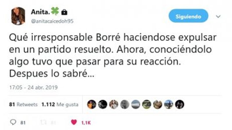 Ana Caicedo, es periodista y está casada con Rafael Santos Borré, el delantero de River que ayer vio la roja a dos minutos del final del partido. Ella fue totalmente crítica por la jugada de la expulsión de su marido: "Que irresponsable Borré haciéndose expulsar en un partido resuelto", escribió en su cuenta de Twitter.