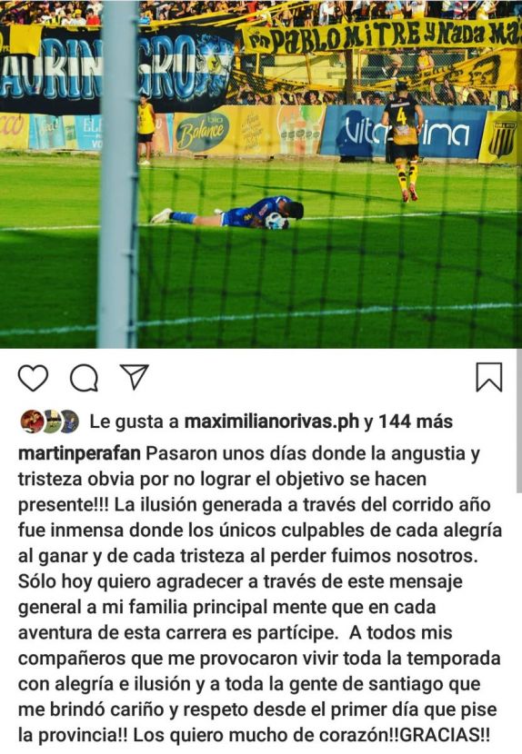 Mitre no cerró el año de la mejor manera tras quedar eliminado del Reducido por el segundo ascenso. Martín Perafán fue uno de los más queridos por el hincha aurinegro y luego de unos días del último encuentro, posteó un mensaje en su cuenta de Instagram.