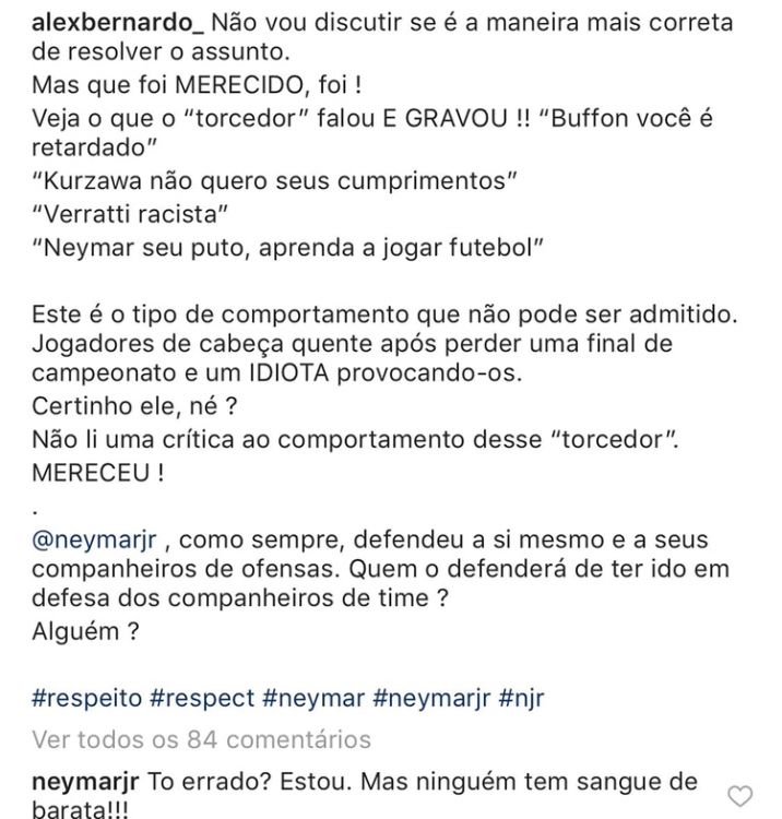"No voy a discutir si fue la manera más correcta de resolver el asunto. ¡Pero que fue merecido, lo fue! Dijo esto y lo grabó: 'Buffon, eres un payaso. Kurzawa, no quiero tus saludos. Verratti, racista. Neymar eres un cabrón, aprender a jugar'", se leía junto al video.