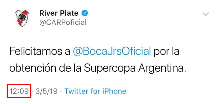 River felicitó a Boca por la obtención de la Supercopa Argentina tras vencer a Rosario Central en los penales. En un principio pareció un buen gesto del Millonario, pero enseguida los seguidores se dieron cuenta de la gastada y viralizaron el saludo. Los Community Managers esperaron hasta las 12.09 para postear el saludo.