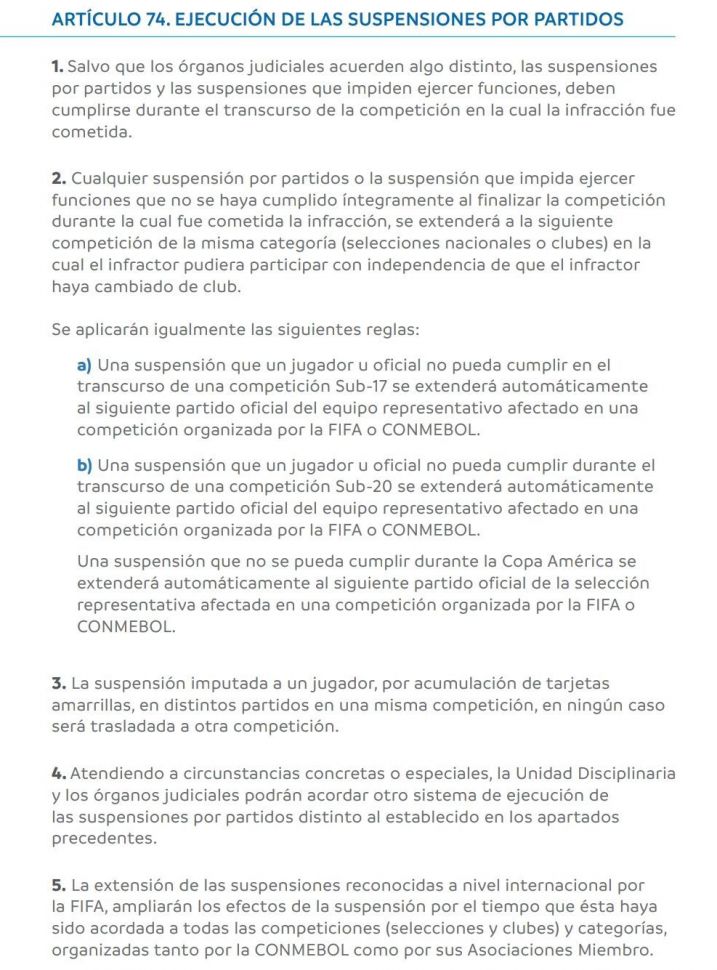 Los artículos 74.1 y 74.2 del Reglamento Disciplinario de Conmebol confirman que "las suspensiones que impiden ejercer funciones deben cumplirse en la competición en la cual la infracción fue cometida".
