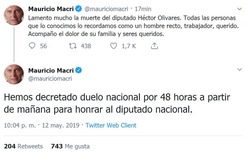 "Todas las personas que lo conocimos lo recordamos como un hombre recto, trabajador, querido. Acompaño el dolor de su familia y seres queridos", sostuvo Macri en su cuenta de Twitter.