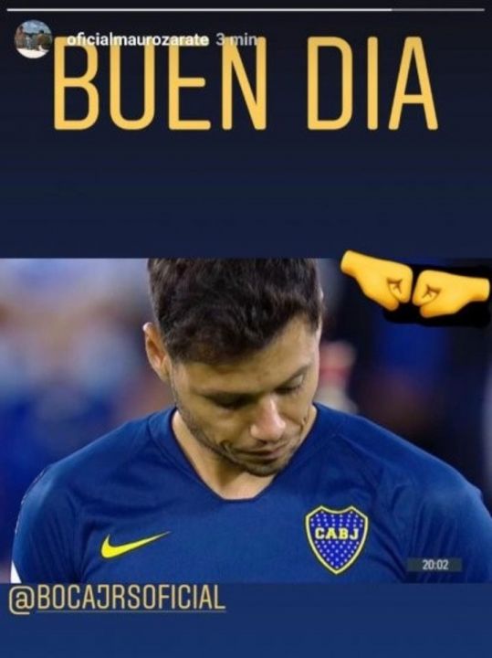 En una historia, el delantero publicó una captura del momento más caliente en la noche de Liniers, cuando sonó el Himno. Allí, Zárate eligió una imagen en la que parece estar mirando el escudo de Boca y la acompañó con el mensaje "Buen día" y dos emojis de puños chocándose.