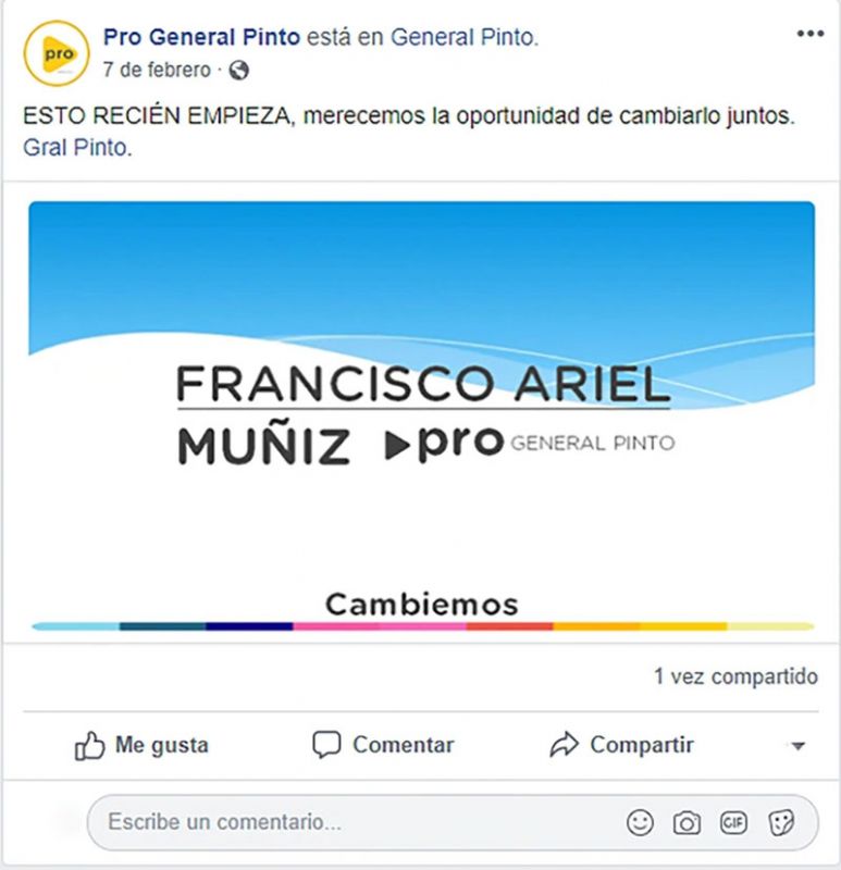 Así y todo, Muñiz continuó con un comportamiento en las redes como si nada ocurriera: creó la página de Facebook "PRO General Pinto", donde llegó a diseñar afiches con su nombre como presunto candidato o boletas en las que aparecía su nombre.