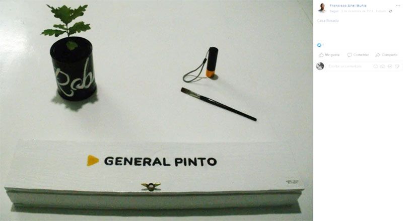 La primera reflejaba un recipiente rectangular de madera, que en su frente contenía el logo del PRO y el título General Pinto. Sobre la mesa también había un pincel y una planta.