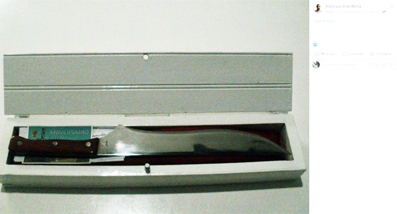 En la segunda foto, la caja de madera ya estaba abierta y se podía percibir lo que había en su interior: un filoso cuchillo de campo.