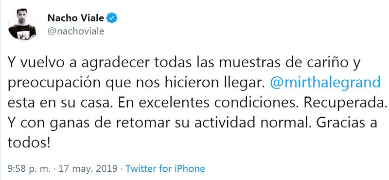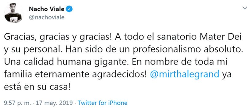 La noticia de la recuperación de Mirtha la dio su nieto Nacho Viale, vía Twitter. En esa red social, el también productor del programa de su abuela escribió: "Gracias, gracias y gracias! A todo el sanatorio Mater Dei y su personal. Han sido de un profesionalismo absoluto Una calidad humana gigante. En nombre de toda mi familia eternamente agradecidos! Mirtha Legrand ya está en su casa!"