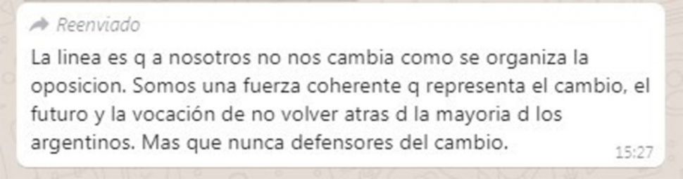 Fueron cuatro líneas de WhatsApp que se reenviaron con una viralidad inusitada dentro de los grupos de mensajería de Cambiemos.