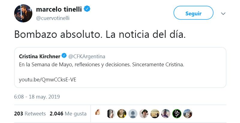 Marcelo Tinelli mostró su asombro esta mañana ante la inesperada revelación de que Cristina Kirchner finalmente aspiraría al puesto de vicepresidenta en una fórmula presidencial encabezada por Alberto Fernández.