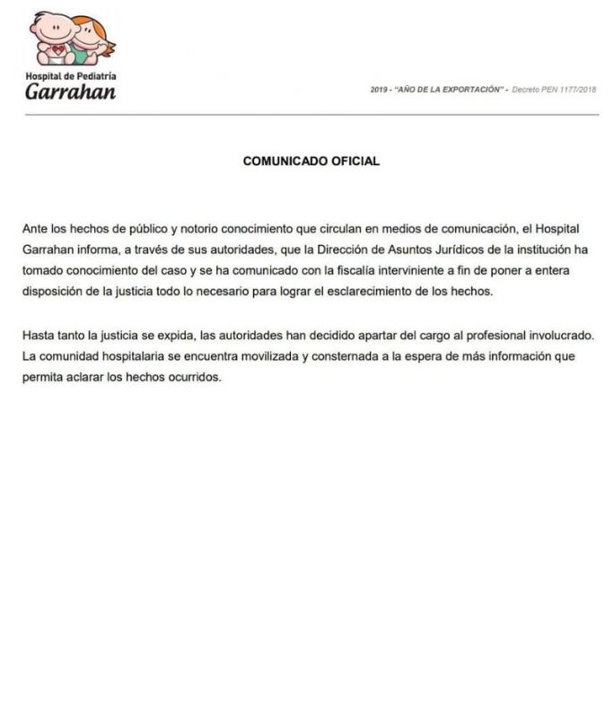 A su vez, desde el Hospital Garrahan emitieron un comunicado en donde informan que el pediatra involucrado fue apartado de su cargo.