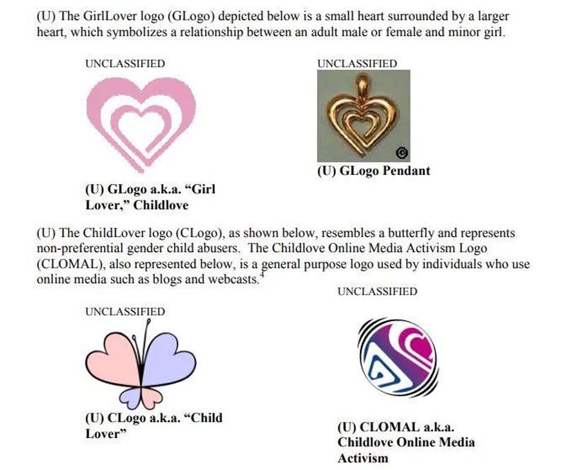 En 2007, la agencia estadounidense armó un listado con los distintos logotipos que se suelen usar en las redes de pedofilia para indicar las preferencias de contenido.
