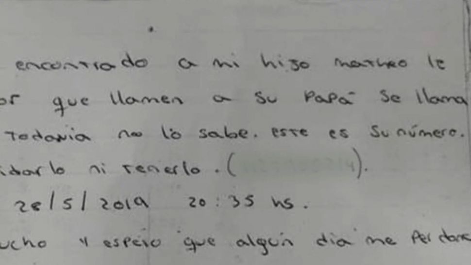 Al acercarse encontraron un bebé con apariencia de recién nacido, vestido y con una nota que decía: "quien alla encontrado a mi hijo Mateo le pido por favor que llame a su papá se llama Joaquín y todavía no lo sabe, este es su número no puedo cuidarlo ni tenerlo 15 (...). Nació ayer 28/05/2019 a las 20:35. Lo amo mucho y espero que algún día me perdone (sic)".
