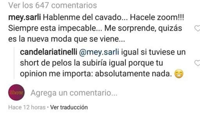 Cande compartió el vestuario en las redes y enseguida aparecieron insólitos comentarios referidos a la parte más íntima de la hija del conductor de Showmatch. Una usuaria en particular dijo que estaba sorprendida de que la cantante, siempre atenta a lo estético, hubiera descuidado la depilación en esa zona; "Hagan zoom", pidió.