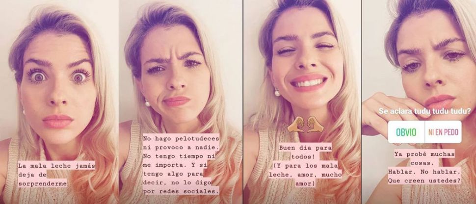 "La mala leche jamás deja de sorprenderme. No hago pelo... ni provoco a nadie. No tengo tiempo ni me importa. Y si tengo algo para decir, no lo digo por redes sociales. Para los mala leche, amor, mucho amor. ¿Se aclarará tudu tudu tudu? Ya probé muchas cosas. Hablar. No hablar. ¿Qué creen ustedes", escribió.
