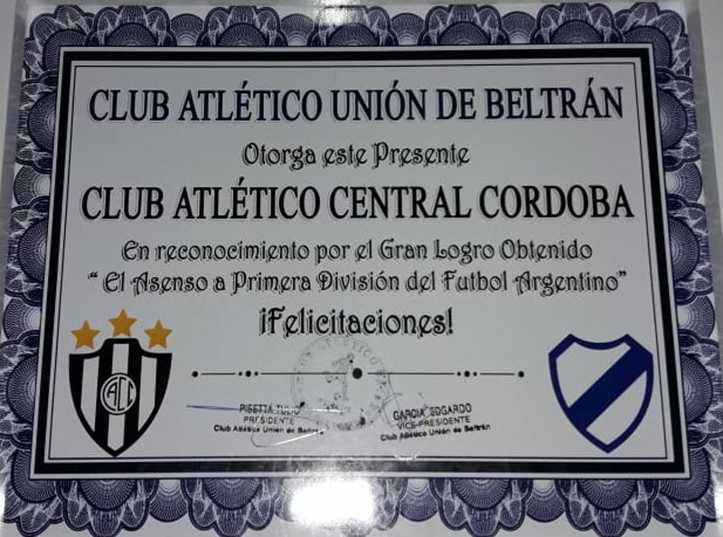 En el entretiempo, la dirigencia beltranense le entregó un reconocimiento a sus pares de Central Córdoba por el ascenso conseguido a la Primera División del fútbol argentino.