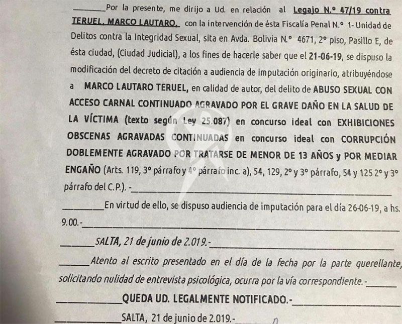Los nuevos delitos que se le atribuyen a Marco Lautaro Teruel son de "abuso sexual con acceso carnal continuado por el grave daño en la salud de la víctima en concurso ideal con exhibiciones obscenas agravadas continuadas en concurso ideal con corrupción doblemente agravado por tratarse de menor de 13 años y por mediar engaño".