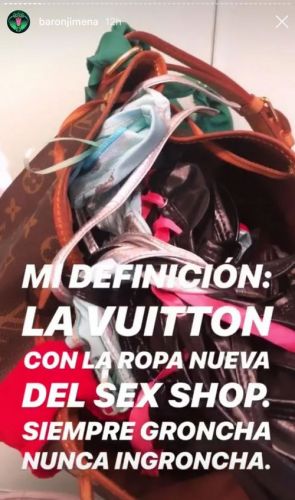 Jime abrió su cartera y le sacó una foto a su interior en la que, claramente, pueden verse diferentes conjuntos de lencería: negros y engomados, rosados con brillitos y celestes. Siempre pícara, expresó: "Mi definición: la Vuitton con la ropa nueva del sex shop. Siempre groncha, nunca ingroncha".